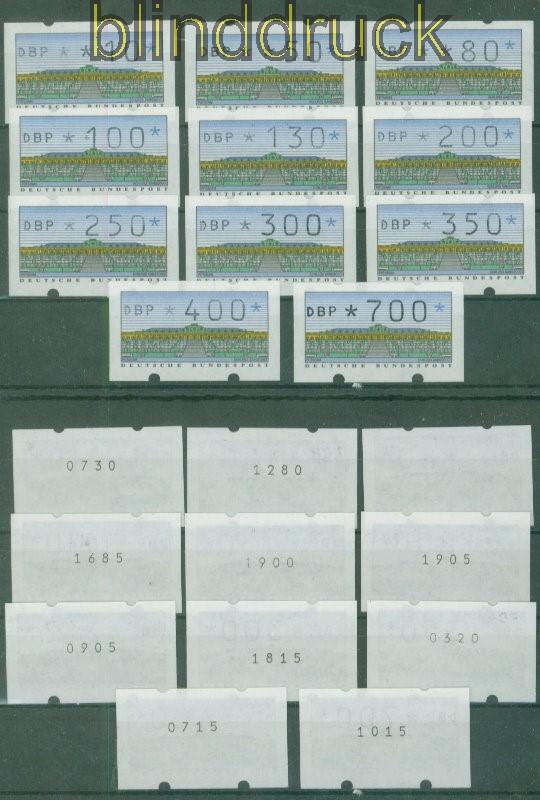 Bundesrepublik ATM 1993 Mi # 2 Type 1.1 Tastensatz 2 postfrisch bis auf 80 Pfg komplett mit Nummer Automatenmarken Ausgabe 1993 Type 1.1 Tastensatz 2 bis auf 80 Pfg. alle Marken mit rückseitiger Nummer postfrisch Erhaltung siehe Scan