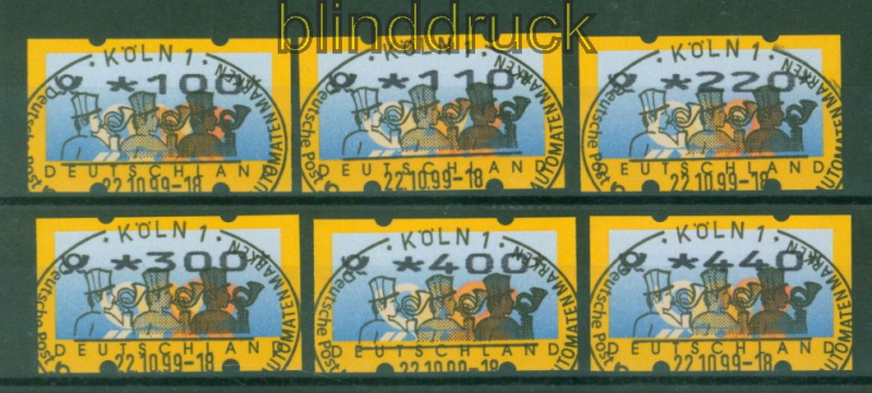 Bundesrepublik Automatenmarken ATM 1999 Mi # 3.2 Versandstellensatz 1 Ersttags-Sonderstempel SSt. Postembleme Type 2 Versandstellensatz 1 einheitlich gestempelt mit Ersttags-Sonderstempel Köln 22.10.1999 Erhaltung siehe Scan