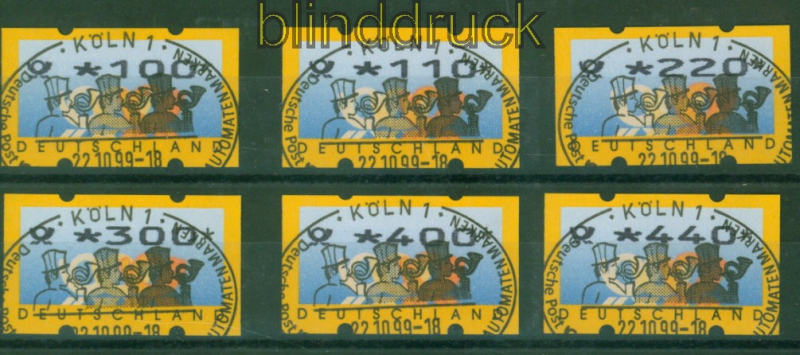 Bundesrepublik Automatenmarken ATM 1999 Mi # 3.2 Versandstellensatz 1 Ersttags-Sonderstempel SSt. Postembleme Type 2 Versandstellensatz 1 einheitlich gestempelt mit Ersttags-Sonderstempel Köln 22.10.1999 Erhaltung siehe Scan