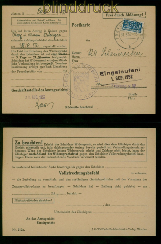 Bundesrepublik Frei durch Ablösung Orts-Dienst-Postkarte Freyung 31.8.1952 Dienstpostkarte Amtsgericht Freyung Frei durch Ablösung mit Notopfermarke als Orts-Dienstpostkarte aus Freyung 31.8.1952 Erhaltung siehe Scan