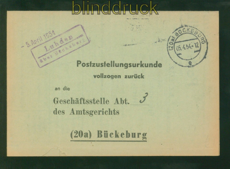 Bundesrepublik Landpoststempel Luhden über Bückeburg 5.4.1954 Zustellungsurkeunde Landpoststempel Luhden über Bückeburg nebengesetzt auf Postzustellungsurkeunde an das Amtsgericht Bückeburg Erhaltung siehe Scan