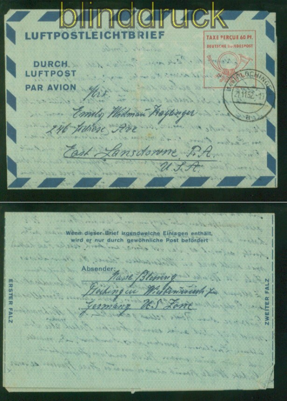 Bundesrepublik Luftpostleichtbrief LF 3 gestempelt 1952 in die USA 60 Pfg. Luftpostleichtbrief aus Plochingen 21.11.1952 in die USA in der Mitte senkrecht gefaltet Erhaltung siehe Scan