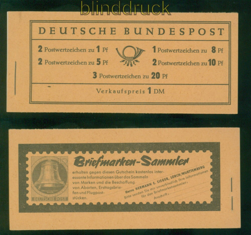 Bundesrepublik Markenheftchen Mi # 4 Y II postfrisch Heuss liegendes Wasserzeichens Heuss Markenheftchen 1960 Wasserzeichen Y II Randleiste mit einer breiten rosalinna und einer halben grauen Strichelleiste bedruckt postfrisch