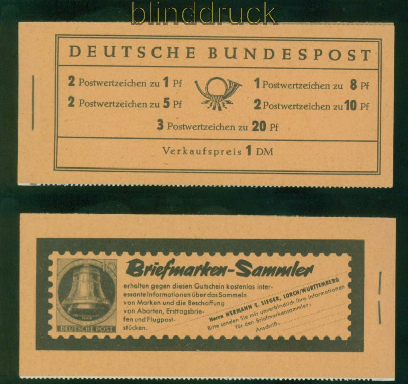 Bundesrepublik Markenheftchen Mi # 4 Y II postfrisch Heuss liegendes Wasserzeichens Heuss Markenheftchen 1960 Wasserzeichen Y II Randleiste mit je einer breiten rosalilla und grauen Strichelleiste bedruckt postfrisch