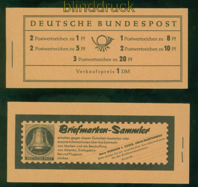 Bundesrepublik Markenheftchen Mi # 4 Y II postfrisch Heuss liegendes Wasserzeichens Heuss Markenheftchen 1960 Wasserzeichen Y II Randleiste mit je einer breiten rosalilla und grauen Strichelleiste übereinander bedruckt postfrisch