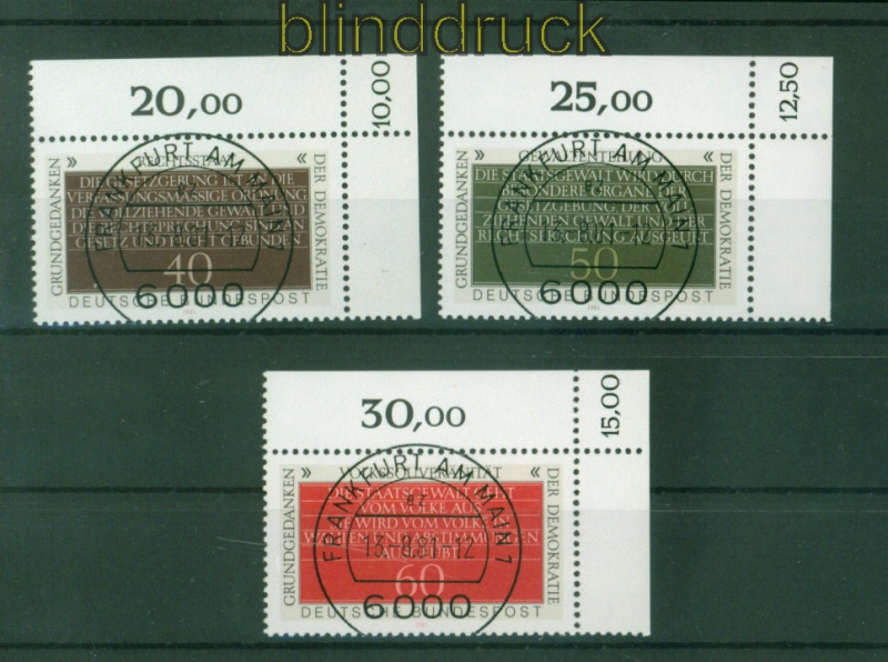 Bundesrepublik Mi # 1105/07 KBWZ Grundgedanken der Demokratie Grundgesetz Grundgedanken der Demokratie Grundgesetz mit korrigierten Bogenwertzähler KBWZ Versandstellenstempel Frankfurt nicht gefaltet Erhaltung siehe Scan