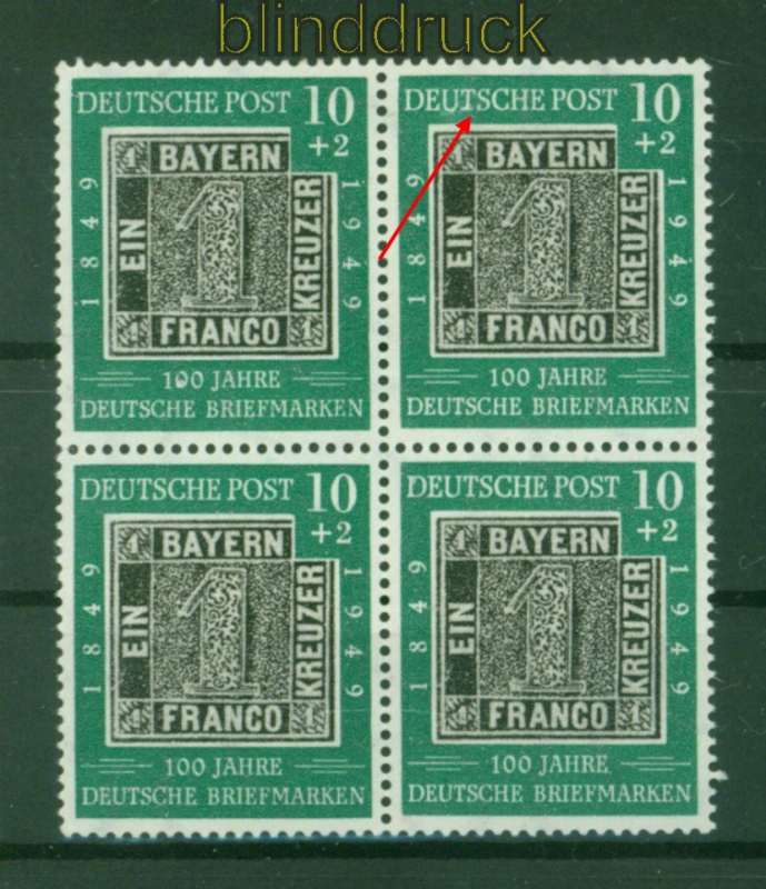 Bundesrepublik Mi # 113 III postfrisch im 4er-Block Plattenfehler 10 Pfennig 100 Jahre Deutsche Briefmarken mit Plattenfehler III: Retusche von Mi # 113 I U und T unregelmäßig postfrisch im 4er-Block (waagerecht gefaltet) einwandfreie Erhaltung siehe Scan
