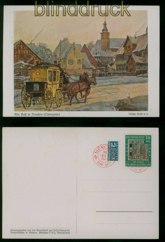 Bundesrepublik Mi # 113 auf FDC mit roten Sonderstempel SSt. farb-AK alte Post in Franken 10 Pfennig 100 Jahre deutsche Briefmarken auf farb-Postkarte Motiv alte Post in Franken mit roten Sonderstempel vom Ersttag 30.9.1949 Erhaltung siehe Scan