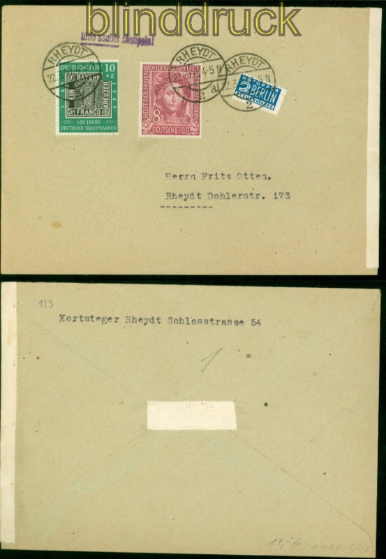 Bundesrepublik Mi # 113 und # 117 auf Ortsbrief Rheydt 22.6.1950 10 Pfennig 100 Jahre deutsche Briefmarken mit 8 Pfg. Helfer der Menschheit 1949 auf Ortsbrief Rheydt 22.3.1950 sauber gestempelt Erhaltung siehe Scan