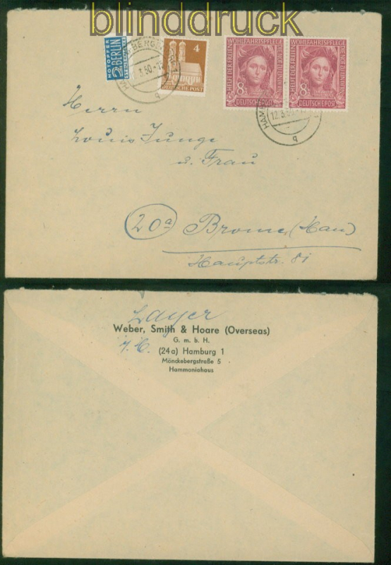 Bundesrepublik Mi # 117 (2) und # 74 eg MiF Fernbrief Hamburg 12.3.1950 nach Brome Notopfermarke 8 Pfg. Helfer der Menschheit 1949 als waagerechtes Paar mit Notopfermarke auf Fernbrief gelaufen aus Hamburg-Bergedorf 12.3.1950 nach Brome Erhaltung siehe Scan
