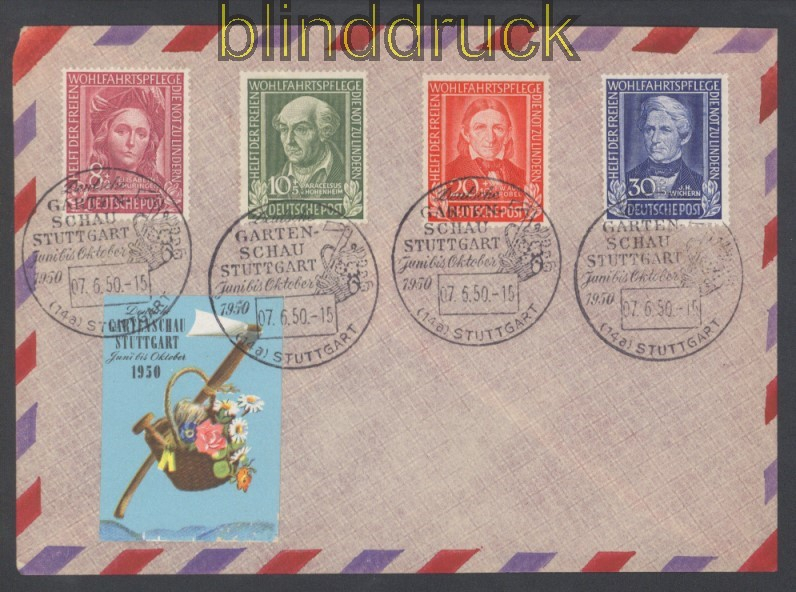 Bundesrepublik Mi # 117/20 Satzbrief SSt Gartenschau1950 mit Sonderkarte Helfer der Menschheit 1949 als Satzbrief auf Luftpostumschlag jede Marke sauber entwertet mit Sonderstempel SSt Landesgartenschau Stuttgart 1950 zusätzlich vorderseitig verklebte Vignette zur Gartenschau innenliegend als Beigabe eine Sonderpostkarte zur Gartenschau mit dem selben Motiv der Vignette gute Erhaltung siehe Scan