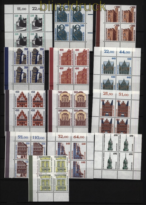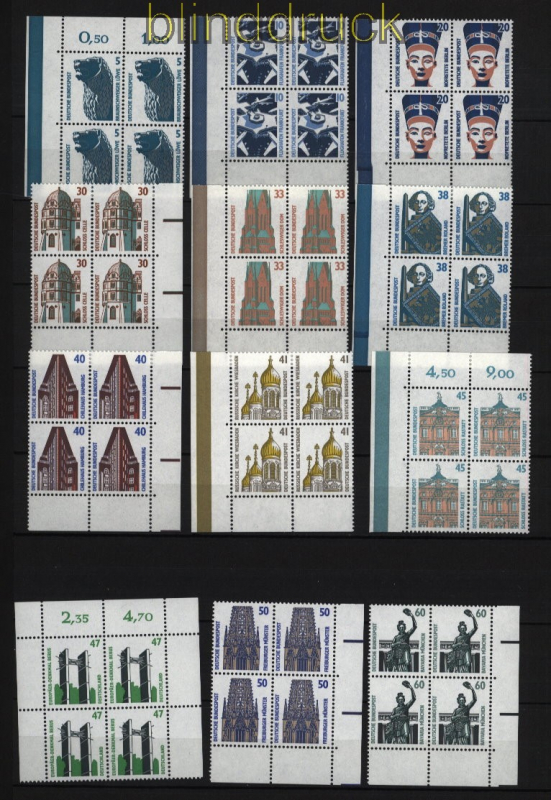 Bundesrepublik Mi # 1339/2009 postfrisch Sehenswürdigkeiten als 4er-Blöcke vom Eckrand Freimarkenausgbe Sehenswürdigkeiten SWK 4er-Blöcke vom Eckrand Ausgaben in DM-Währung postfrisch nicht gefaltet Erhaltung siehe Scan