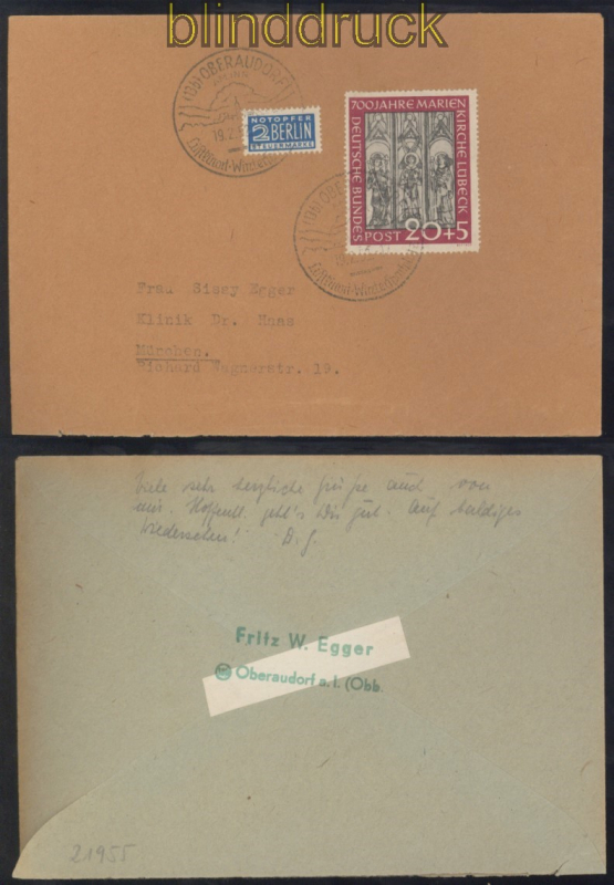 Bundesrepublik Mi # 140 EF Fernbrief portogerecht Oberaudorf 1952 portogerecht auf Fernbrief aus Oberaudorf 19.2.1952 nach München mit Notopfermarke Marken entwertet mit Sonderstempel Erhaltung siehe Scan