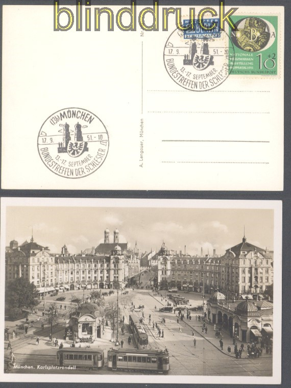 Bundesrepublik Mi # 141 EF NABA Wuppertal SSt. Bundestreffen der Schlesier München 1951 10 Pfennig Nationale Briefmarkenausstellung Wuppertal 1951 Einzelfrankatur auf Blanko-sw-Ansichtskarte München Marke entwertet mit Sonderstempel Bundestreffen der Schlesier Erhaltung siehe Scan
