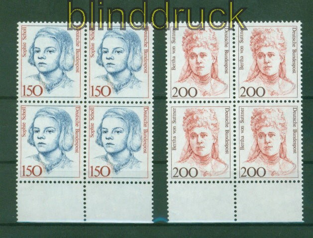 Bundesrepublik Mi # 1497/98 postfrisch Frauen 4er-Blöcke vom Unterrand 150 und 200 Pfg. Frauen der Deutschen Geschichte (XII) 4er-Blöcke vom Unterrand postfrisch Erhaltung siehe Scan