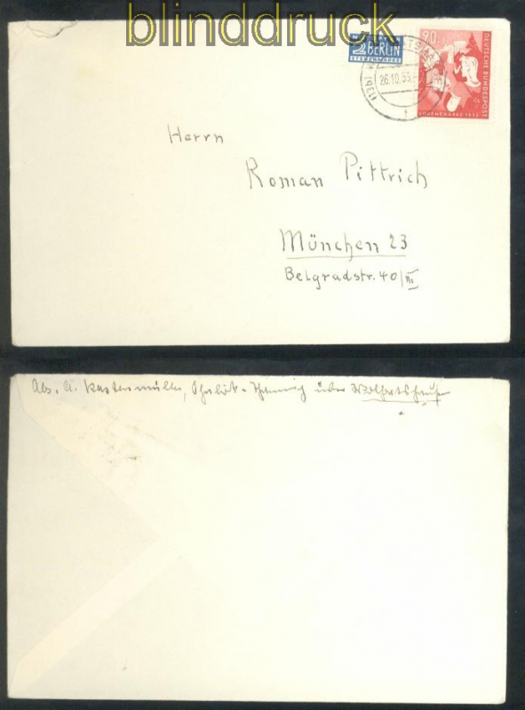 Bundesrepublik Mi # 154 EF auf Fernbrief Wolfratshausen 1953 20 Pfennig Bundesjugendplan portogerechte Einzelfrankatur EF auf Fernbrief gelaufen aus Wolfratshausen 26.10.1953 nach München Erhaltung siehe Scan
