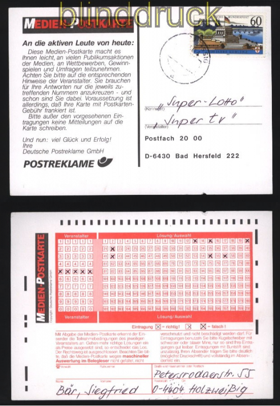 Bundesrepublik Mi # 1583 x EF auf Postkarte Holzweissig nach Bad Hersfeld 60 Pfg. 2000 Jahre Koblenz ohne Fluoreszenz ale Einzelfrankatur EF auf Postkarte aus Holzweissig nach Bad Hersfeld Erhaltung siehe Scan