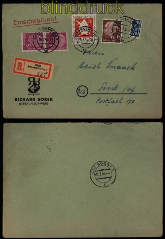 Bundesrepublik Mi # 179 (2), 190 und 199 MiF auf Einschreiben Braunschweig 1954 nach Soest schöne Mischfrankatur MiF auf Einschreiben aus Braunschweig 26.7.1954 nach Soest Erhaltung siehe Scan