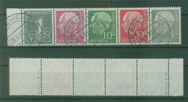 Bundesrepublik Mi # 179 Y/285 Y II gestempelt Heuss liegendes Wasserzeichen 5er-Streifen geprüft Schlegel BPP Heuss I Dauerserie 5 Werte mit liegendem Wasserzeichen in Type II (Nachauflage) mit Mi # 285 Y komplette Ausgabe im 5er-Streifen gestempelt geprüft Schlegel BPP Erhaltung siehe Scan