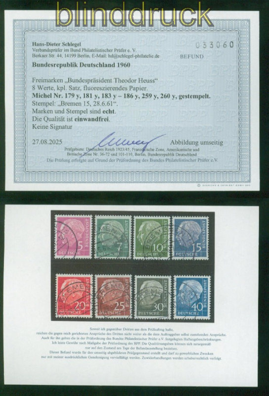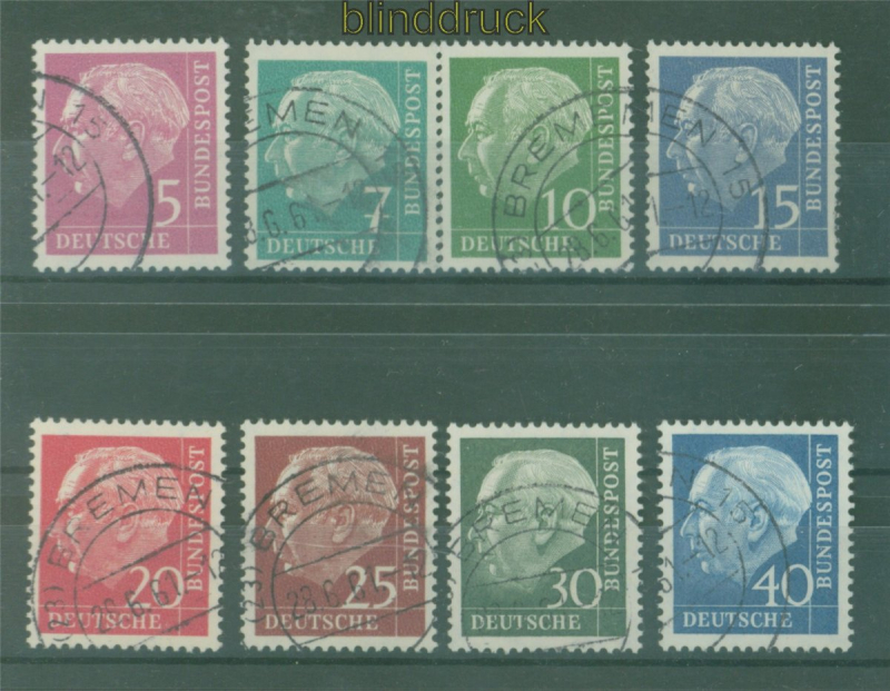 Bundesrepublik Mi # 179y/260y gestempelt Heuss Lumogen Fotobefund Schlegel BPP Heuss fluoreszierendes Papier komplette Ausgabe gestempelt Fotobefund Schlegel BPP: ".... Marken und Stempel sind echt, die Qualität ist einwandfrei" Erhaltung siehe Scan