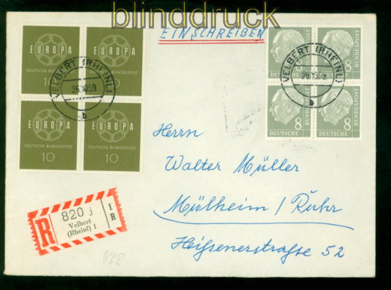 Bundesrepublik Mi # 182 (4) in MiF auf R-Brief Velbert nach Mülheim Ruhr 8 Pfg. Heuss I im 4er-Block in Mischfrankatur auf Einschreiben aus Velbert 26.10.1959 nach Mülheim Ruhr Erhaltung siehe Scan