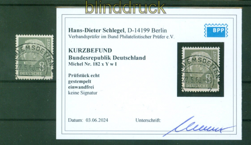 Bund Mi # 182 x Y w I gestempelt Heuss I Kurzbefund Schlegel BPP lgd. Wz(57066)