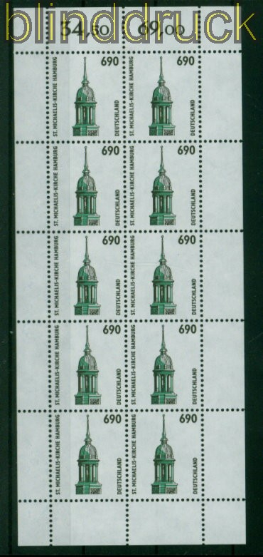 Bundesrepublik Mi # 1860 kompletter 10er-Bogen postfrisch 690 Pfennig Freimarke Sehenswürdigkeiten St. Michaelis-Kirche in Hamburg kompletter postfrischer 10er-Bogen einwandfreie Erhaltung siehe Scan