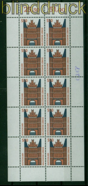 Bundesrepublik Mi # 1938 postfrisch 510 Pfg. Sehenswürdigkeiten im 10er-Bogen 510 Pfennig Sehenswürdigkeiten SWK im 10er-Bogen postfrisch Erhaltung siehe Scan