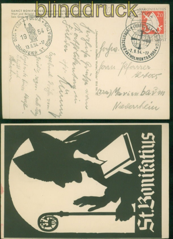 Bundesrepublik Mi # 199 Bonifatius-Sonderkarte mit 3 verschiedenen Stempeln 20 Pfg. St. Bonifatius auf Sonderpostkarte mit drei verschiedenen Stempeln: Sonderstempel Deutscher Katholikentag Fulda 2.9.1954, Tagesstempel Fulda 3.9.1954 Sonderstempel Fulda 1200 Jahrfeier 13.6.1954 Erhaltung siehe Scan