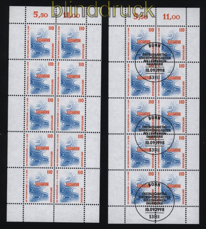 Bundesrepublik Mi # 2009 postfrisch und gestempelt Sehenswürdigkeiten komplette 10er-Bögen 110 Pfennig Sehenswürdigkeiten EXPO 2000 Hannover SWK zwei komplette 10er-Bögen postfrisch und gestempelt einwandfreie Erhaltung siehe Scan