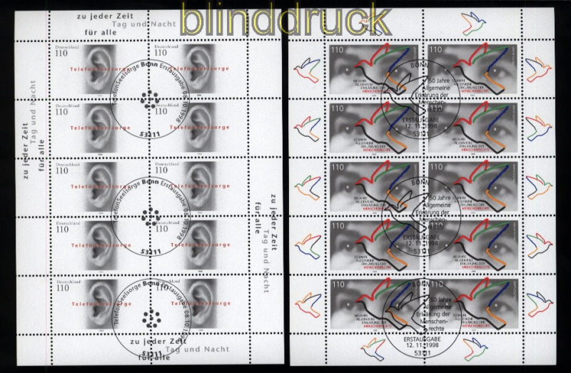 Bundesrepublik Mi # 2020, 2021, 2022, 2025 und 2026 Sonderstempel kplt. 10er-Bogen fünf 10er-Bögen aus dem Jahr 1998 komplette Ausgaben entwertet mit Sonderstempel SSt. einwandfreie Erhaltung siehe Scan