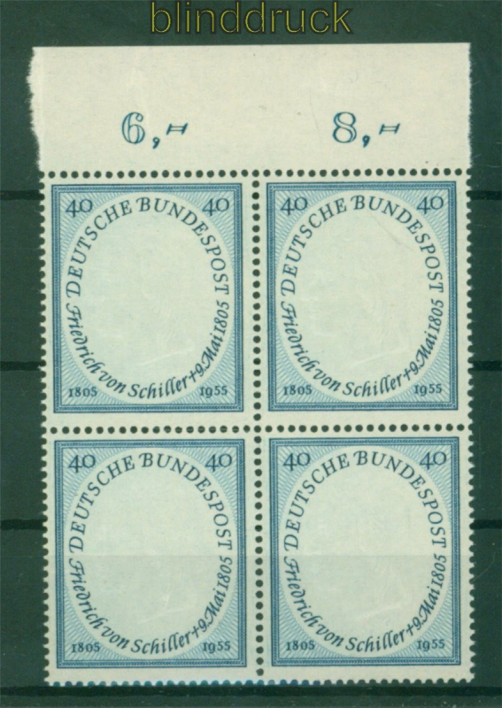 Bundesrepublik Mi # 210 postfrisch 4er-Block vom Oberrand Friedrich von Schiller 40 Pfennig 150. Todestag von Friedrich von Schiller als 4er-Block vom Oberrand einwandfrei postfrisch nicht gefaltet einwandfreie Erhaltung siehe Scan