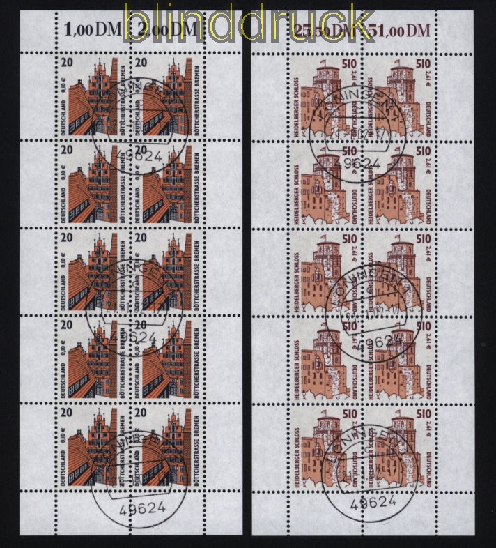 Bundesrepublik Mi # 2224/25 A gestempelt Sehenswürdigkeiten komplette 10er-Bögen Sehenswürdigkeiten SWK mit Doppelnominale DM/Euro komplette Ausgabe komplette 10er-Bögen sauber gestempelt Löningen einwandfreie Erhaltung siehe Scan