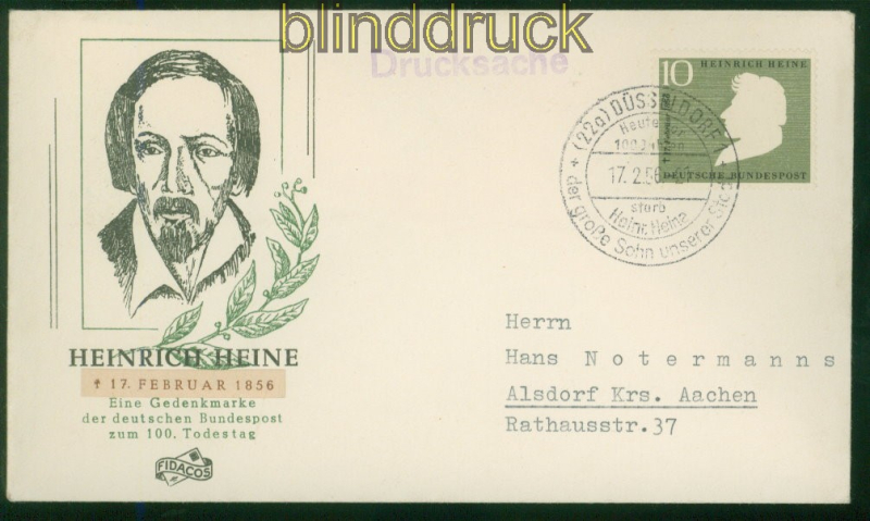 Bundesrepublik Mi # 229 Heinrich Heine auf gelaufenen Fidacos Ersttagsbrief FDC 100. Todestag von Heinrich Heine auf als Drucksache gelaufener Fidacos-Ersttagsbrief adressiert und gelaufen Erhaltung siehe Scan