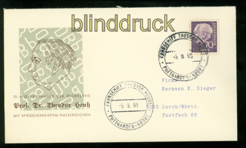 Bundesrepublik Mi # 263 z gestempelt spiegelverkehrtes Wasserzeichen Schiffspostbrief 70 Pfennig Heuss II mit Wasserzeichen 5 Z seitenverkehrt als Einzelfrankatur EF entwertet mit Sonderstempel SSt. Fährschiff Theodor Heuss Puttgarden-Rodby 5.9.1963 auf Brief mit 200,00 bewertet güntig angeboten Erhaltung siehe Scan