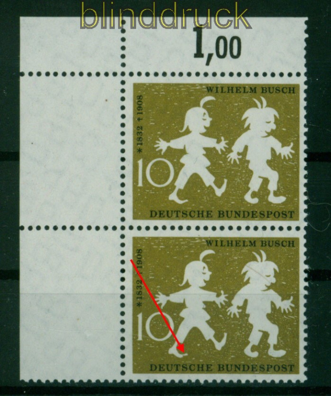 Bundesrepublik Mi # 281 I postfrisch Moritz mit Zeh Plattenfehler 10 Pfg. Wilhelm Busch mit Plattenfehler I: Moritz mit Zeh im senkrechten Eckrandpaar postfrisch Erhaltung siehe Scan