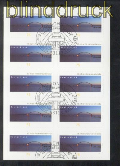 Bundesrepublik Mi # 3003 Folienblatt # 29 Fehmarnsundbrücke Ersttagssonderstempel 75 Cent 50 Jahre Fehmarnsundbrücke komplettes Folienblatt Ersttagssonderstempel Bonn Erhaltung siehe Scan