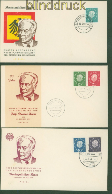 Bundesrepublik Mi # 302/06 Ersttagsbrief FDC Heuss (III) Medaillon auf drei FDC Heuss (III) Medaillon auf drei FDC Ersttagsbriefen Erhaltung siehe Scan
