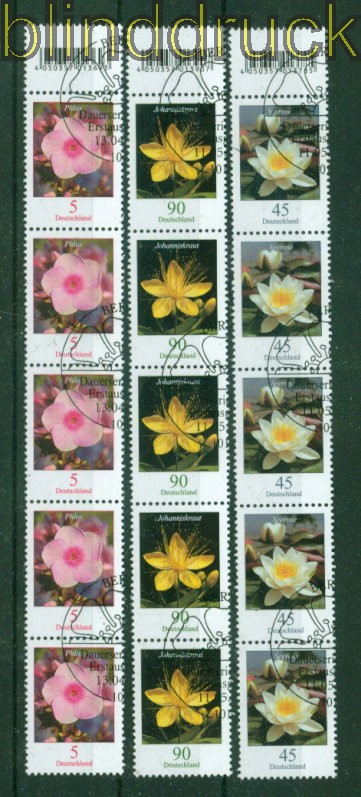 Bundesrepublik Mi # 3296 und 3303/04 gestempelt 6er-streifen mit EAN Blumen 5 Pfennig Blumen, 45 Pfennig Blumen und 90 Pfennig Blumen Jeweils als 6er-Streifen mit Zwischenfeld und EAN-Codierung Sonderstempel Erhaltung siehe Scan