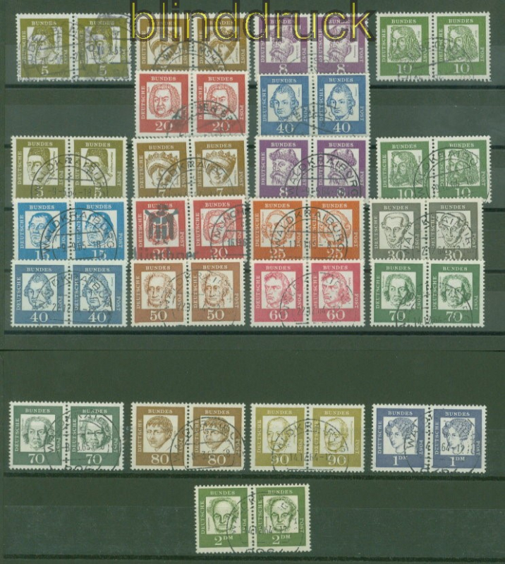 Bundesrepublik Mi # 347/62 x und y ohne 351 x gestempelt Bedeutende Deutsche waagerechte Paare Bedeutende Deutsche bis auf 351 x komplette Ausgabe als waagerechte Paare in normalem und fluoreszierendem Papier waagerechte Paare gestempelt Erhaltung siehe Scan