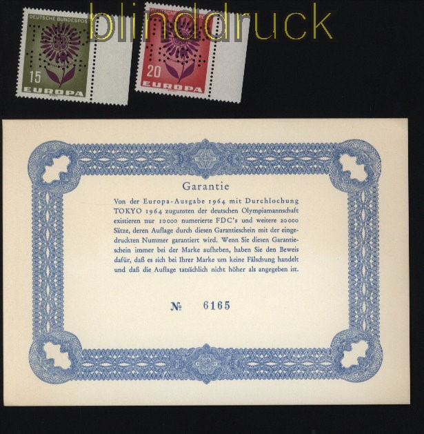 Bundesrepublik Mi # 445/46 postfrisch Europa 1964 mit Lochung TOKYO 1964 Olympiade Europa-Marken 1964 postfrisch Marken mit Lochung TOKYO 1964 mit nummerierter Garantiekarte für die Olymiade-Sammlung Erhaltung siehe Scan