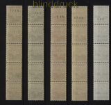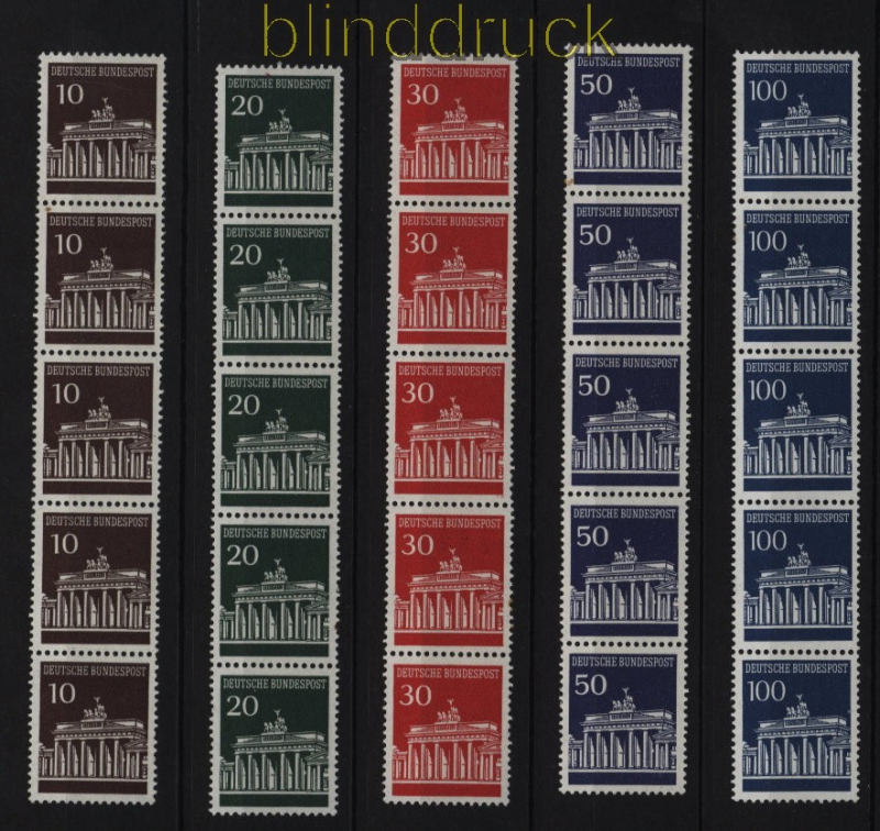 Bundesrepublik Mi # 506/10 R Brandenburger Tor postfrische 5er-Streifen mit Nummer Brandenburger Tor Rollenmarken komplette Ausgabe senkrechte 5er-Streifen alle mit rückseitiger Nummer Mi # 510 mit matter Gummierung postfrisch Erhaltung siehe Scan