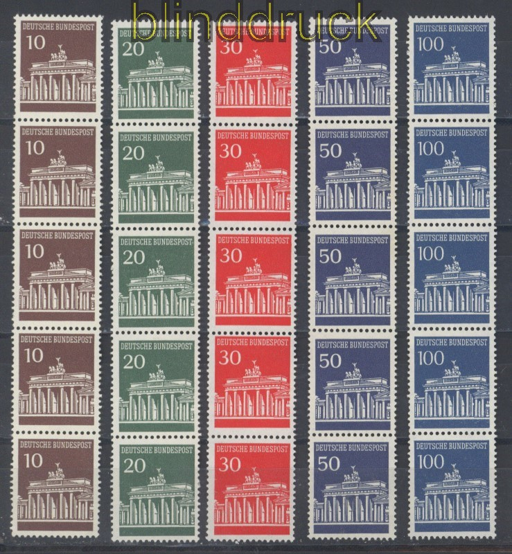 Bundesrepublik Mi # 506/10 w R Brandenburger Tor postfrische 5er-Streifen mit Nummer Brandenburger Tor mit Dextrin-Gummierung Rollenmarken komplette Ausgabe senkrechte 5er-Streifen alle mit rückseitiger Nummer postfrisch Erhaltung siehe Scan