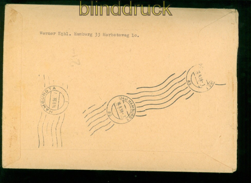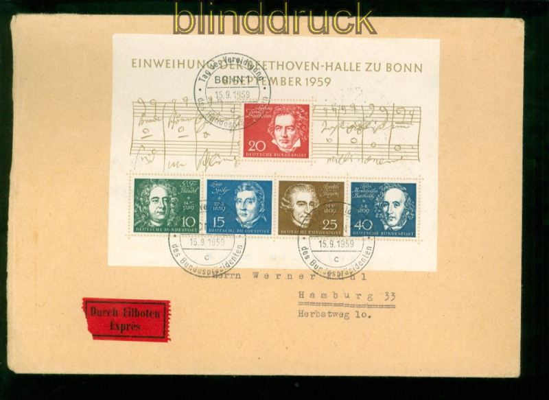 Bundesrepublik Mi # Block 2 auf Eilbotenbrief mit SSt. Kennbuchstabe c nach Hamburg Beethovenblock auf Eilbotenbrief mit Sonderstempel vom 15.9.1959 mit Kennbuchstabe c gelaufen nach Hamburg Ankunftsstempel Erhaltung siehe Scan