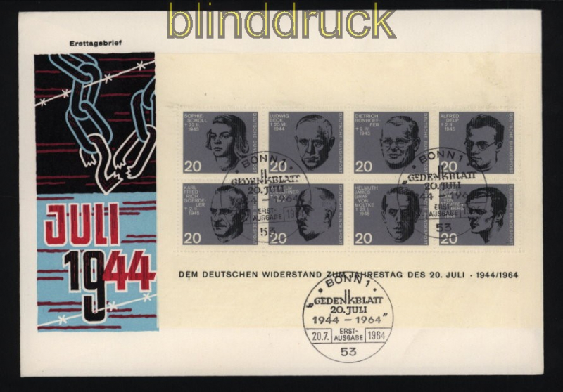 Bundesrepublik Mi # Block 3 Widerstandskämpferblock auf Ersttagsbrief FDC Widerstandskämpferblock 20 Juli 1944 auf Ersttagsbrief Sonderstempel nicht adressiert Erhaltung siehe Scan