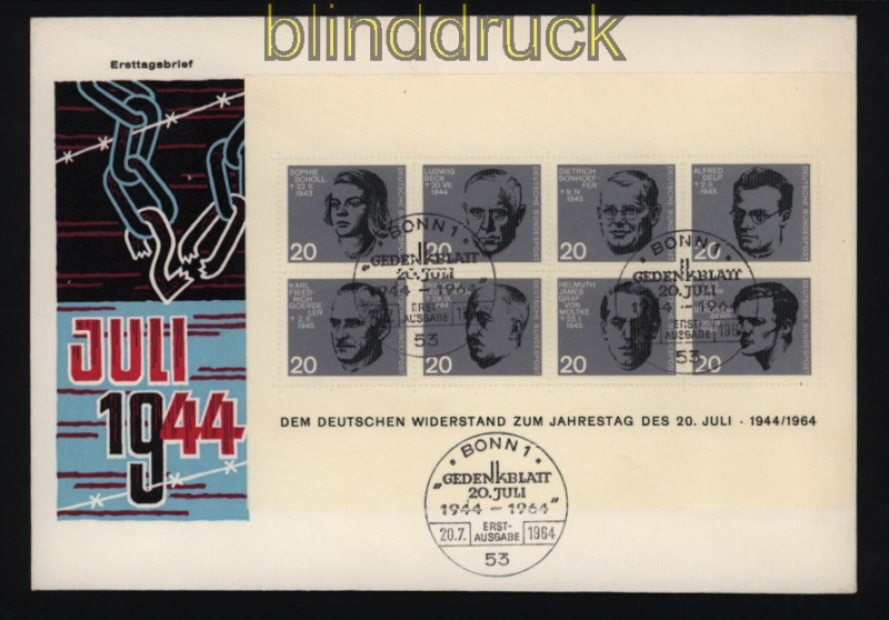 Bundesrepublik Mi # Block 3 Widerstandskämpferblock auf Ersttagsbrief FDC Widerstandskämpferblock 20 Juli 1944 auf Ersttagsbrief Sonderstempel nicht adressiert Erhaltung siehe Scan