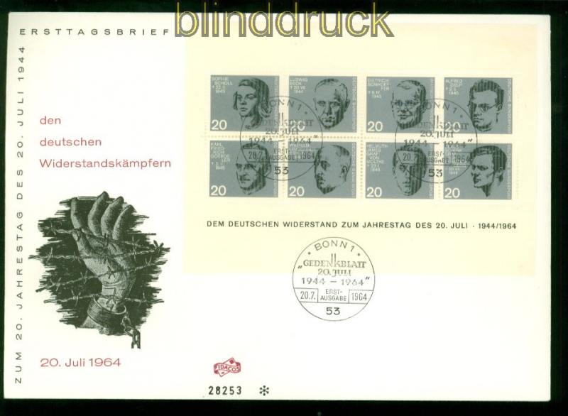 Bundesrepublik Mi # Block 3 Widerstanskämpferblock auf Ersttagsbrief FDC Widerstanskämpferblock 20 Juli 1944 auf Schmuck- Ersttagsbrief Sonderstempel Erhaltung siehe Scan