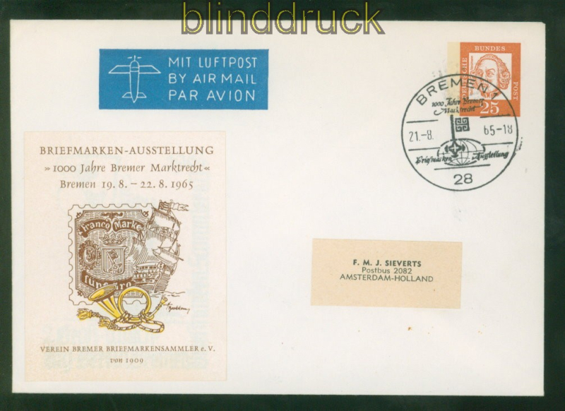 Bundesrepublik PU 22/2 SSt Privatumschlag LuPo 1000 Jahre Bremer Marktrecht Sonderstempel Privatumschlag 25 Pfennig Bedeutende Deutsche Briefmarkenausstellung 1000 Jahre Bremer Marktrecht mit Sonderstempel Bremen 21.8.1965 nach amsterdam Erhaltung siehe Scan