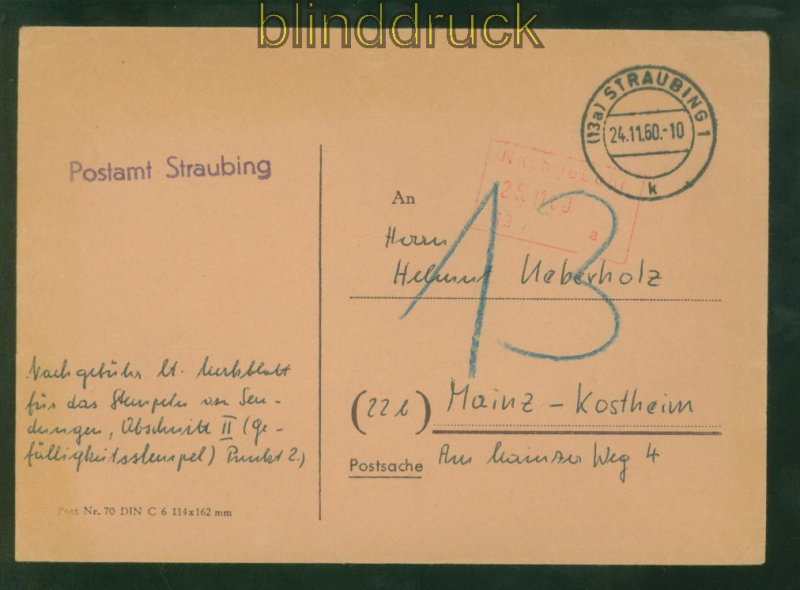 Bundesrepublik Postsache Postsache Umschlag Einziehung von Nachgebühr Straubing 24.11.1960 nach Mainz Umschlag als Postsache des Postamts Straubing zur Einziehung von 13 Pfennig Nachgebühr lt. Merklatt für das Stempeln von Sendungen, Abschnitt II (Gefälligkeitsstempel) Punkt 2 gelaufen aus Straubing 24.11.1960 nach Mainz-Kostheim Selten !!! Erhaltung siehe Scan