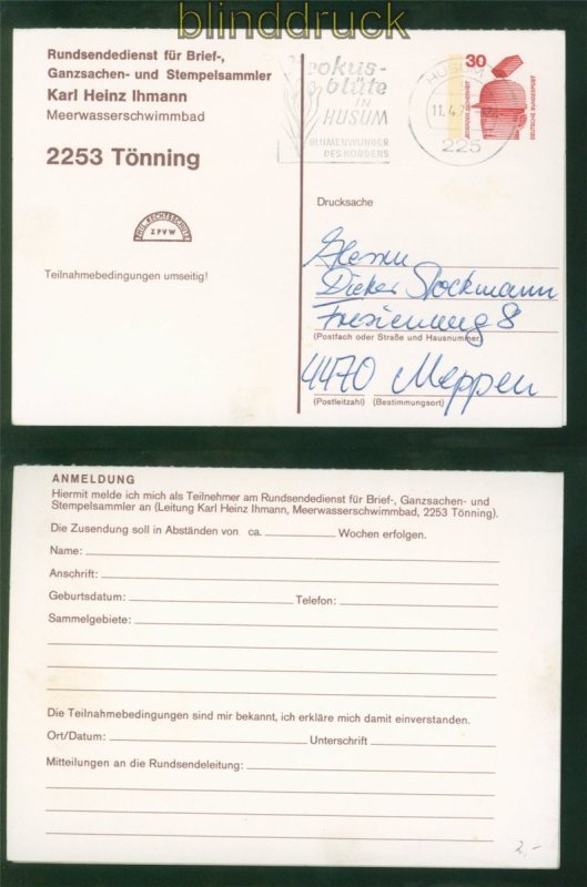 Bundesrepublik Privat-Postkarte PP 94/2 Rundsendedienst Ihmann in Tönning 1977 nach Meppen 30 Pfg. Unfallverhütung Privatpostkarte des rundsendedienstes für Brief-, Ganzsachen- und Stempelsammler Karl-Heinz Ihmann in 2253 Tönning mit anhängender Antwortkarte gelaufen als Drucksache aus Husum 11.4.1977 nach Meppen Erhaltung siehe Scan